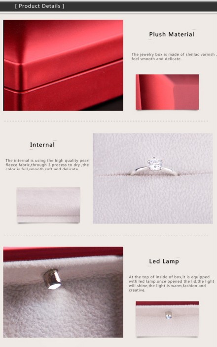 Red leatherette ring box with an LED light built into the lid! Let your ring shine with our new LED light ring box, this powerful white LED light will make your ring sparkle the moment the box opens.